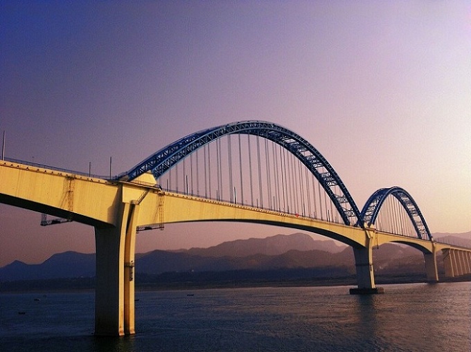 宜萬鐵路宜昌長江大橋位于宜昌港煙收壩水域,全長2527米,橋面設計為雙軌道,主梁連續(xù)剛構跨徑達275米,在同類型鐵路橋中位居全國第一。拱肋計算跨度264米,為目前國內(nèi)鐵路最大跨度的鋼管混凝土拱。